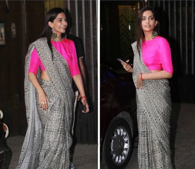 Now I will be the first to say – to pull off House of Masaba it takes a certain type of fashionista to make something garish look delicate and feminine. Ahem, Sonam Kapoor. Not only the way she styles her pieces, the accessories and hair/mua make the look. It makes something go from punk rock chaos turn into something feminine and delicate. The green saree, had it not been draped the way she has, it would just look like fabric overwhelming her.