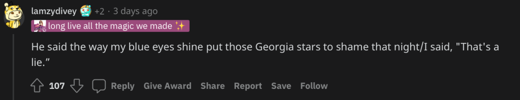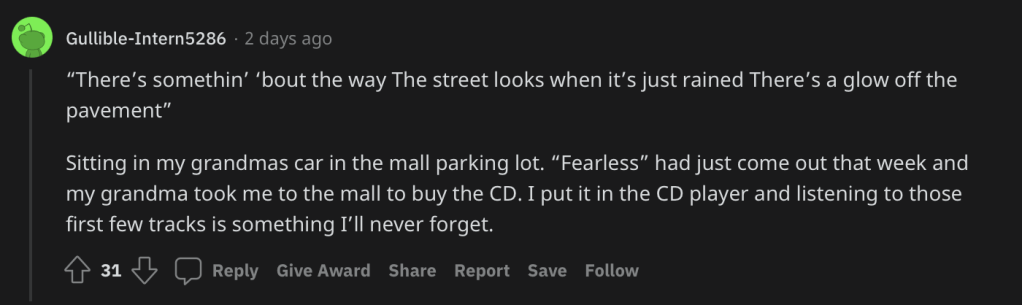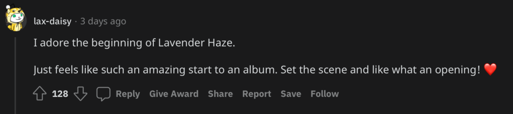 I posted this discussion on a subreddit called r/taylorswift. It started an interesting couple of threads and discussion on Taylor’s music. Thought I’d share them on here!