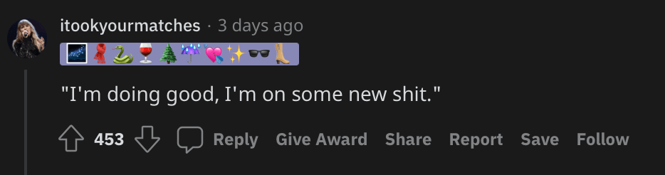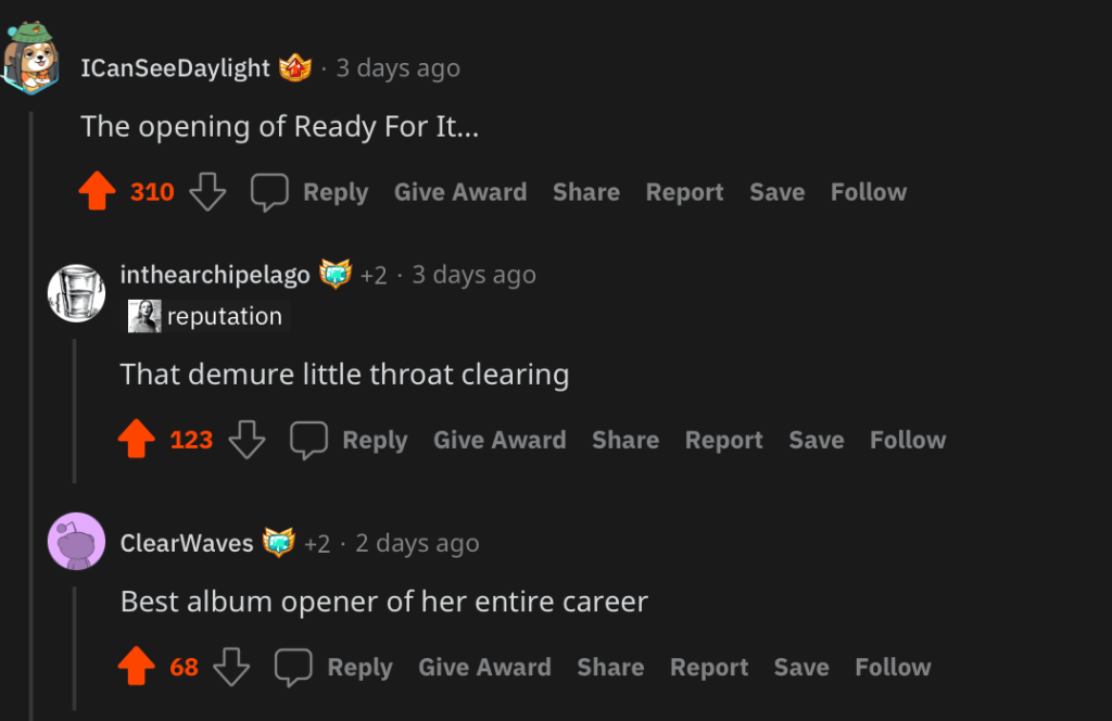 Do you have any that come to mine? My personal favourites are definitely the Reputation album opening. It immediately leave a mark.