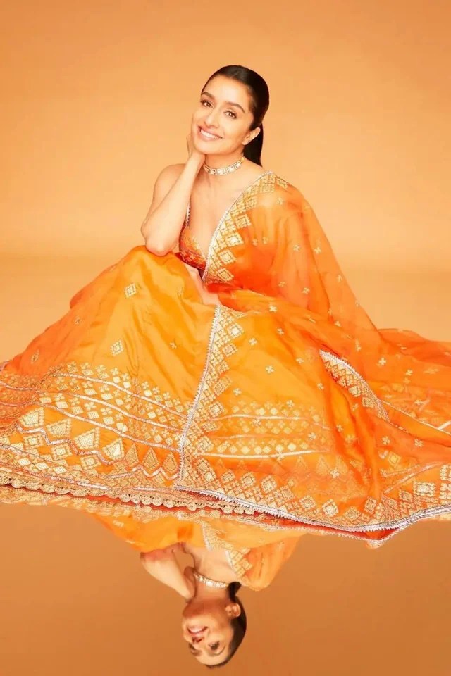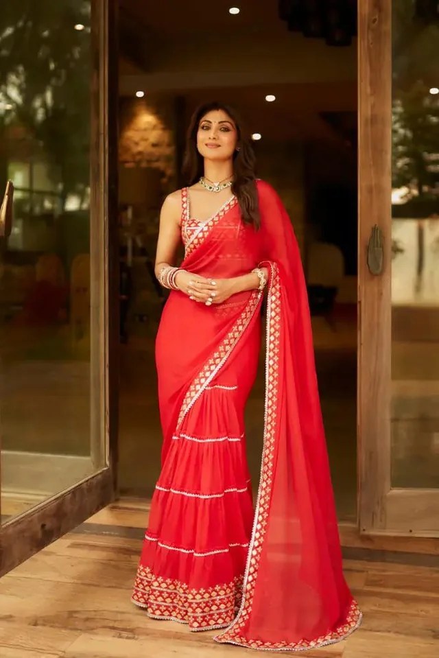 They create these signature drapes separators and somehow it gives the saree more structure and adds to the femininity. The actual saree fabric apart from the tiers is pretty minimal, the blouse balances everything perfectly.